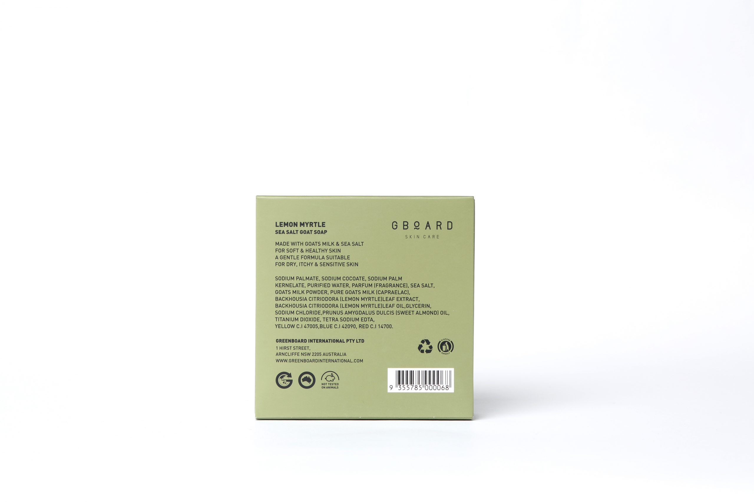 SODIUM PALMATE, SODIUM COCOATE, SODIUM PALM KERNELATE,PURIFIED WATER (AQUA), GOAT MILK, GLYCERIN, SEA SALT, SUCROSE,PEG-7 GLYCERYL COCOATE, BACKHOUSIA CITRIODORA (LEMON MYRTLE) LEAF EXTRACT,TETRASODIUM EDTA, SWEET ALMOND (PRUNUS AMYGDALUS DULCIS) OIL, PARFUM (FRAGRANCE).